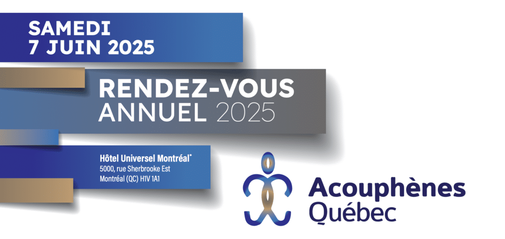 Acouphènes Québec a le plaisir de vous inviter au Rendez-Vous Annuel 2025 qui se tiendra (en présentiel), le samedi 7 juin prochain à l’Hôtel Universel, Montréal.