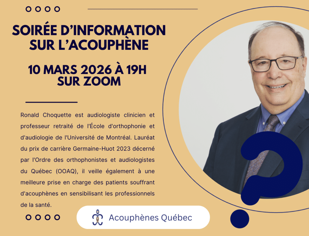 Les acouphènes, souvent invisibles, sont pourtant bien réels et peuvent avoir un impact profond sur la qualité de vie de ceux qui en souffrent. Nous vous invitons à une soirée d’information et d’échanges dédiée aux acouphènes. Parce que comprendre ce que vit l’autre, c’est déjà un grand pas pour l’aider. Ensemble, brisons le silence autour des acouphènes.